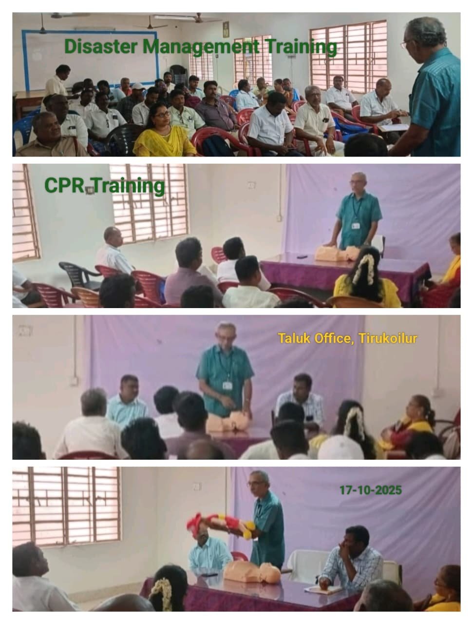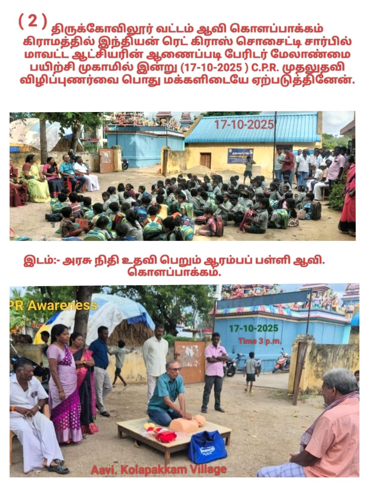 IRCS Kallakurichi conducted vital Disaster Management training for officials in Tirukoilur and a CPR awareness camp in Aavi Kolapakkam village to build community resilience.