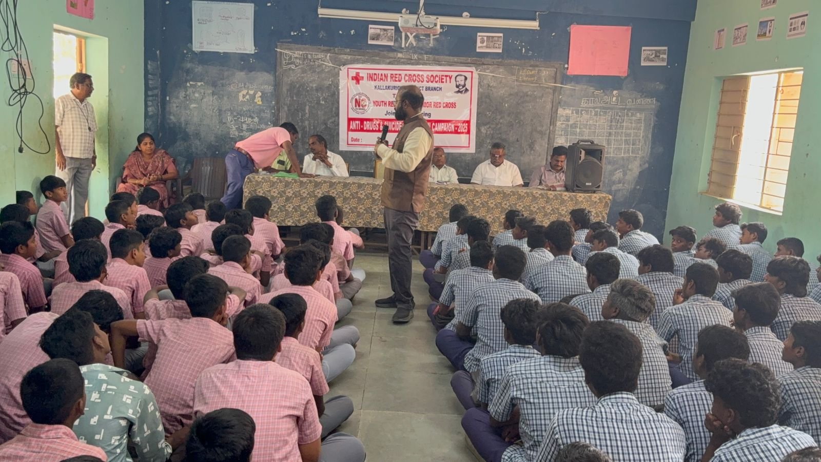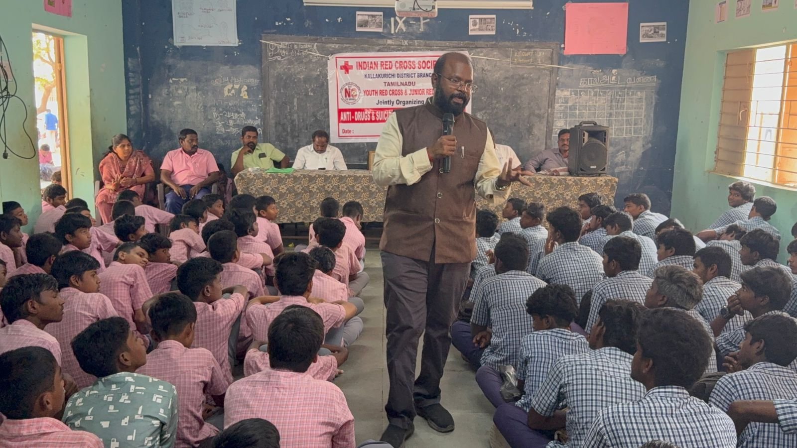 தியாகதுருகம் அரசு ஆண்கள் பள்ளியில் போதை மற்றும் தற்கொலை தடுப்பு கருத்தரங்கம். செஞ்சிலுவை சங்கம் மற்றும் டாக்டர் பொன்னரசு மாணவர்களுக்கு வழிகாட்டினர்.
