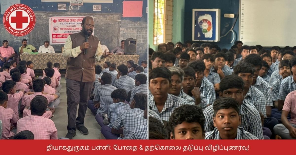 தியாகதுருகம் அரசு ஆண்கள் பள்ளியில் போதை மற்றும் தற்கொலை தடுப்பு கருத்தரங்கம். செஞ்சிலுவை சங்கம் மற்றும் டாக்டர் பொன்னரசு மாணவர்களுக்கு வழிகாட்டினர்.